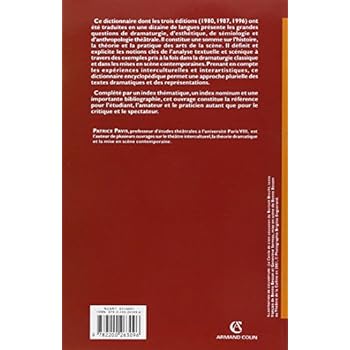 Ce dictionnaire dont les trois éditions (1980, 1987, 1996) ont été traduites en une dizaine de langues présente les grandes questions de dramaturgie, d'esthétique, de sémiologie et d'anthropologie théâtrale. Il constitue une somme sur l'histoire, la théorie et la pratique des arts de la scène. Il définit et explicite les notions clés de l'analyse textuelle et scénique à travers des exemples pris à la fois dans la dramaturgie classique et dans les mises en scène contemporaines. Prenant en compte les expériences interculturelles et interartistiques, ce dictionnaire encyclopédique permet une approche plurielle des textes dramatiques et des représentations.Complété par un index thématique, un index nominum et une importante bibliographie, cet ouvrage constitue la référence pour l'étudiant, l'amateur et le praticien autant que pour le critique et le spectateur.