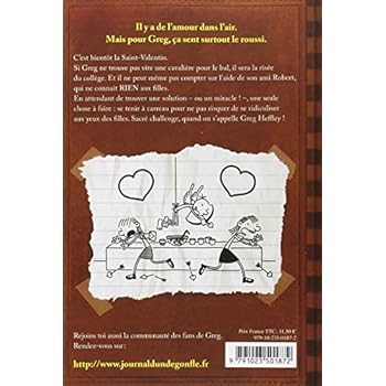 Le monde de Greg s’écroule quand son collège organise un bal pour la Saint Valentin. C’est la panique : si aucune fille n'accepte de l'accompagner, il sera la risée de l'école. Et il ne peut pas compter sur l’aide de son ami Robert, qui n'y connaît RIEN aux filles.Il lui reste quelques semaines avant le bal. D'ici là, Greg a intérêt à se tenir à carreau et à ne pas se ridiculiser en public, une fois de plus, s'il veut trouver une cavalière… Jeff Kinney est concepteur et réalisateur de jeux vidéo. En 1998, il commence à crayonner son personnage, qui verra le jour sur le web 6 ans plus tard. Quelques 50 millions de connections plus tard, l'éditeur Abrams décide de le publier sur papier, avec le succès qu'on connaît. Jeff Kinney est même devenu l'une des personnalités les plus influentes de l'année 2009 selon le Time Magazine.