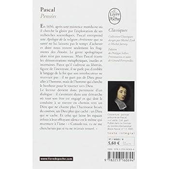 En 1656, après une existence mondaine où il cherche la gloire par l'exploitation de ses recherches scientifiques, Pascal entreprend une Apologie de la religion chrétienne que sa santé ne lui laissera pas le temps d'achever et dont nous restent seulement les fragments des Pensées. Le genre apologétique alors n'est pas nouveau. Mais Pascal écarte les démonstrations métaphysiques, inutiles et incertaines. Parce qu'il s'adresse au libertin, figure de l'incroyant, il ne parle pas d'emblée le langage de la foi que son interlocuteur ne recevrait pas : il ne part pas de Dieu pour aller à l'homme, mais de l'homme qui cherche le bonheur pour le tourner vers Dieu.Le lecteur devient donc partenaire d'un dialogue : il s'aventure dans une démarche où tout son être est engagé et qui doit le conduire à se mettre en chemin vers un Dieu que ne chante plus l'harmonie brisée du cosmos, un Dieu plus que caché : un Dieu qui se cache. Et celui qui laisse les espaces infinis à leur effrayant silence est le même qui murmure à l'âme : « Console-toi, tu ne me chercherais pas si tu ne m'avais trouvé. »Edition de Gérard Ferreyrolles.